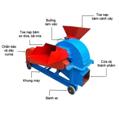 • Tính năng: Máy có chức năng băm nhỏ các loại nguyên liệu gỗ tươi hoặc khô, băm xơ dừa, bã mía,…
