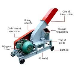Máy được kéo tải bởi đồng cơ 11kW – 380V hoặc đầu nổ D24, cho ra năng suất ấn tượng 1-1,5 tấn/giờ, phù hợp với các xưởng sản xuất và chế biến gỗ quy mô vừa và nhỏ.