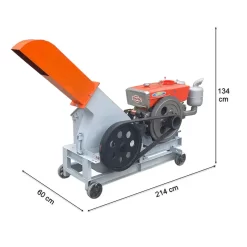 Máy băm gỗ mảnh 2T dùng đầu nổ D24 sử dụng dây curoa truyền lực từ động cơ đầu nổ đến buly máy cho năng suất đạt 1000 – 1500 kg/giờ