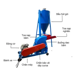 Thành phẩm sau khi băm nghiền sẽ được đưa sang ống nối hút thành phẩm ra ngoài. Máy có thể kết hợp bầu hút gió hỗ trợ thu gom và hạn chế thất thoát thành phẩm sau khi nghiền